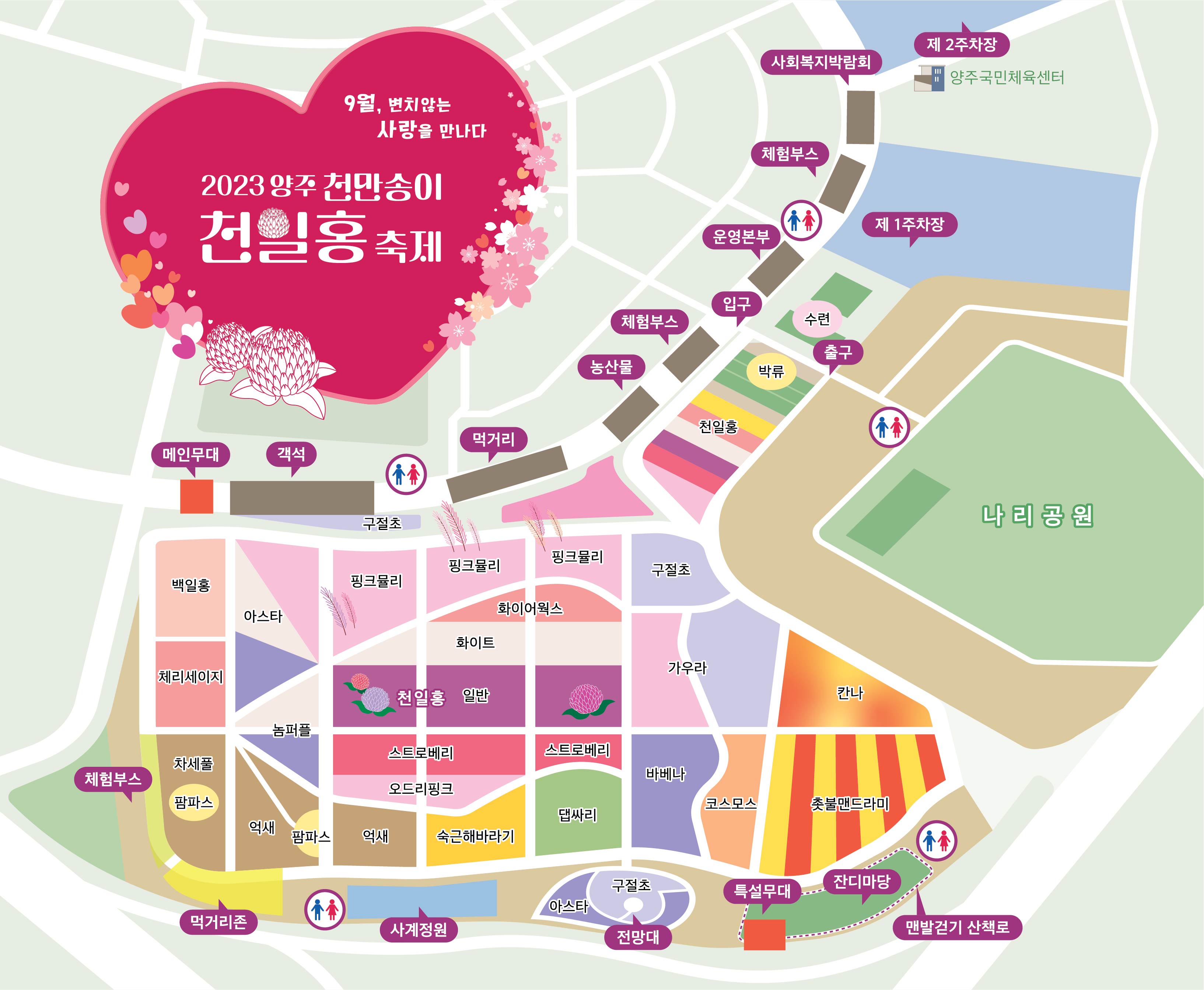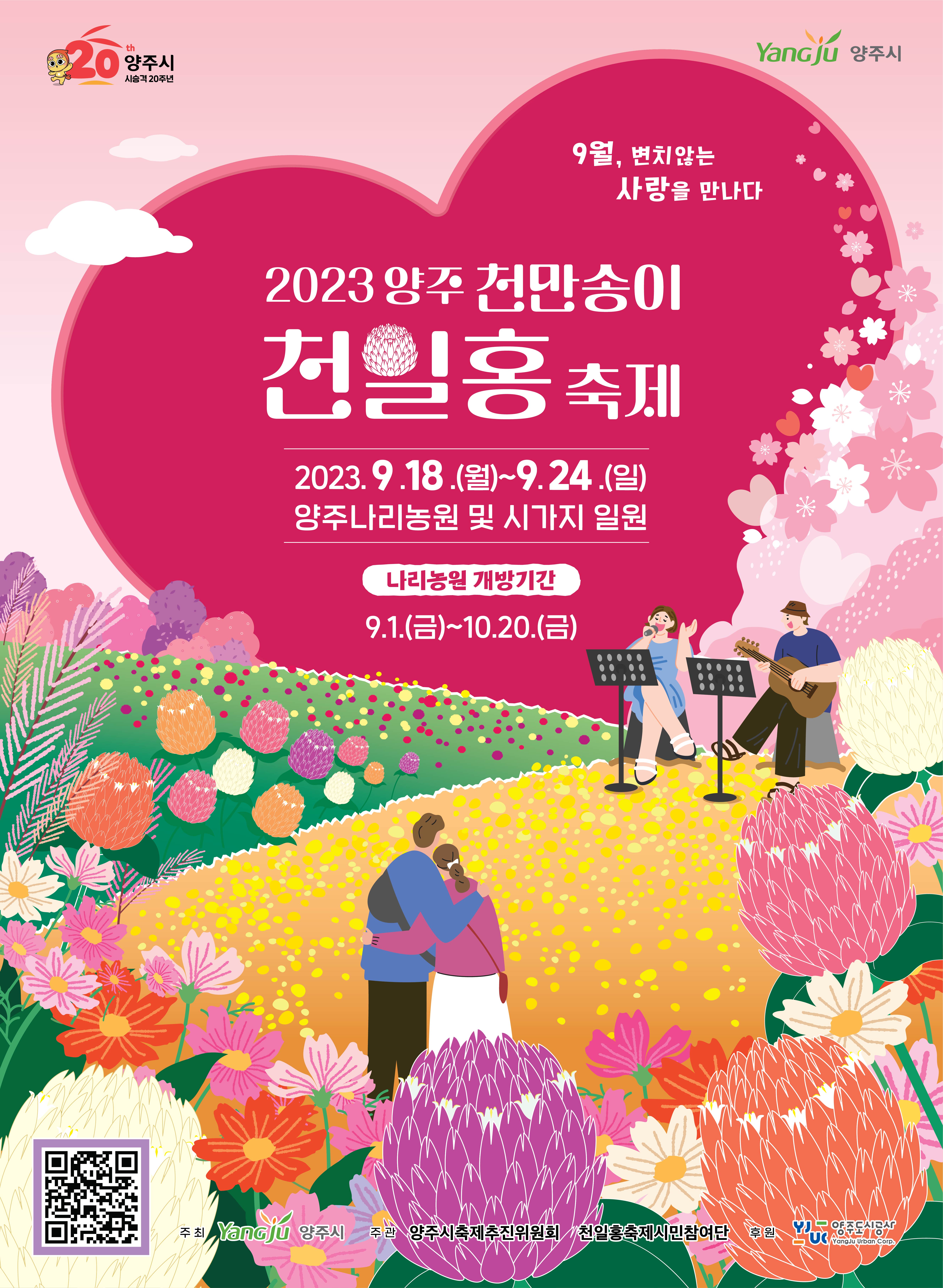 ▶ 천일홍, 핑크뮬리 외 버베나, 체리세이지 등 새로운 꽃 도입 ▶ 9월 18일 ~ 24일까지 천만송이 천일홍 축제 개최 ▶ 매년 수십만 명 인파가 몰리는 경기북부대표축제 경기도 양주시에서 국내 최대 규모 천일홍 꽃 잔치가 펼쳐진다. 6만 6천 155㎡의 규모로 전국 최대의 천일홍 군락지이자 핑크뮬리 전국 4대 성지로 알려진 나리농원에서 오는 9월 1일부터 10월 20일까지 50일간 천일홍 꽃밭을 개장한다. 그리고 오는 9월 18일부터 24일까지는 행사 특별주간으로 나리농원과 고읍시가지 일대에서 ‘2023년 양주 천만송이 천일홍 축제’가 열린다. 2023년 양주 천일홍 축제 슬로건인 ‘9월, 변치않는 사랑을 만나다’는 축제장을 찾은 가족·연인·친구 사이의 관람객들이 나리농원에서 사랑과 우정을 재확인하고 추억을 쌓아가길 바라는 의미를 담았다. 아름다운 경관과 함께 다양한 볼거리와 즐길 거리가 있는 나리농원에서 다가올 가을 분위기를 충분히 만끽해볼 것을 추천해본다. ■ 9월엔 여기어떄? 양주 핫플레이스로 거듭난‘인생샷 맛집’나리농원으로! 양주시 광사동에 소재한 나리농원은 2017년부터 국내 최대의 천일홍 군락지를 조성하며 천일홍축제를 개최해왔다. 특히, 수도권에서 접근성이 좋은 양주 나리농원은 착한 입장료(2천원)에 형형색색의 아름다운 경관 단지를 관람할 수 있으며, 인스타그램 등 SNS에서 수도권 근교 사진 명소로 소문이 나며 남녀노소 모두가 선호하는‘핫플’로, 매년 관람객의 수가 증가하는 추세이다. 천일홍, 핑크뮬리로 유명한 나리농원은 올해 버베나, 체리세이지 등 새로운 꽃을 도입하고 기존 인기있는 꽃들도 재배치하여 형형색색의 다채로운 꽃들이 만개해 우아한 자태를 뽐내는 새로운 나리농원의 모습을 기대해도 좋다. 아울러, 시민건강과 힐링을 위한 나리농원 산책로(맨발 걷기 길)도 조성하여 나리농원을 찾은 방문객에게 색다른 재미도 줄 수 있을 것으로 기대하고 있다. 또한, 예년과 달리 오는 9월 9일부터는 오전 9시부터 오후 9시까지(입장 마감은 오후8시) 관람시간을 3시간 늘려 야간에도 다양한 조명으로 늦은 시간에도 푸른 하늘 배경과 노을이 지는 붉은 석양을 배경으로도 인생사진을 남길 수 있을 것으로 보인다. 야간개장과 발맞추어 농원 내 은은한 조명아래 펼쳐지는 저녁 버스킹 공연은 깊어지는 가을의 밤을 설렘 가득히 물들일 예정이다. 올해 가을에는 나리농원 꽃밭 내 만개한 꽃을 배경으로 연인·가족과 함께 서로의‘인생샷’을 찍어주며 변치않는 사랑을 약속하는 게 어떨까. ■ ‘천일홍 특별주간’ 설렘과 낭만이 가득한 나리농원 천일홍 축제는 올해 50일간의 나리농원 개장기간 중 9월 18일부터 9월 24일까지 일주일간을 ‘천만송이 천일홍축제’ 특별주간으로 선정했다. 특별주간에는 플라워 퍼레이드, 천만송이 천일홍 노래자랑, 천일홍 특별콘서트 등 다양한 시민참여 프로그램을 준비했으며, 상시 개장 기간도 농산물 및 판매 체험부스 운영, 버스킹 공연 등 볼거리 뿐만 아니라 다양한 즐길거리를 준비했다. 올해 나리농원은 ‘천일홍 축제 특별주간’ 설정을 통해 단순히 꽃밭이 아닌 축제의 장이 펼쳐지는 곳으로 변모한다. 다양한 시민참여 이벤트와 프로그램을 통한 풍성한 컨텐츠로, 관람객에게 즐거움을 선사할 예정이다. 나리농원 안에서는 영원한 사랑을 기약하는 ▲리마인드 웨딩 ▲무료 사진 촬영&인화 ▲보이는 라디오 ▲전망대 메시지 이벤트 등이 펼쳐지며, 연인들에게 순간을 영원히 간직할 수 있는 시간을 선물한다. 이와 함께 가족이 함께 즐길 수 있는 프로그램으로, 전문가와 함께하는 ▲식물 강연 프로그램과 ▲반려견 강연 프로그램, ▲어린이 체험형 대형 볼풀&이벤트가 준비되며, 축제장 곳곳의 ▲플라워 판타지 퍼포머들이 이색적인 분위기를 더할 예정이다. 더불어, 축제 주말(23~24일)에는 메인축제로 나리농원 앞 도로변 140여 개의 체험 부스가 설치되어 가족 구성원 모두의 추억을 쌓는 프로그램들이 준비된다. ■ 9월 22일 ~ 24일 메인 축제, 천일홍 축제의 피날레를 장식하다 축제에서의 문화·예술 공연은 빼놓을 수 없는 요소 중 하나이다. 이에 시는 천일홍 축제 기간인 오는 9월 22일부터 24일은 메인축제로 다양한 분야의 문화예술 공연이 펼쳐지며 우리의 눈과 귀를 사로잡는다. 22일에는 나리농원에서 고읍시가지까지 플라워 퍼레이드와 하늘물공원 청년들을 위한 해방파티를 시작으로 23일에는 ▲어린이 태권도 공연 ▲시니어합창 페스티벌 ▲양주시립합창단 축하공연 ▲양주시민들의 끼와 재능을 뽐내는 천일홍 노래자랑 ▲천일홍 특별 콘서트 등이 개최되어, 축제 분위기를 한층 끌어올릴 예정이다. 이어 24일에는 감동적인 가족애를 느낄 수 있는 연극 공연과 우리 소리 국악 한마당, 북 콘서트 등을 진행하며 양주시립교향악단의 폐막공연으로 축제의 마지막을 장식할 예정이다. 천일홍 축제 홍보 및 각종 이벤트에 대한 자세한 사항은 천일홍 축제 공식 인스타그램(https://www.instagram.com/yangju_flower_festa/)과 천일홍 축제 시 홈페이지(https://www.yangju.go.kr/festival/index.do)에서 확인하면 된다. ■ 지역과 상생·도약하는 축제