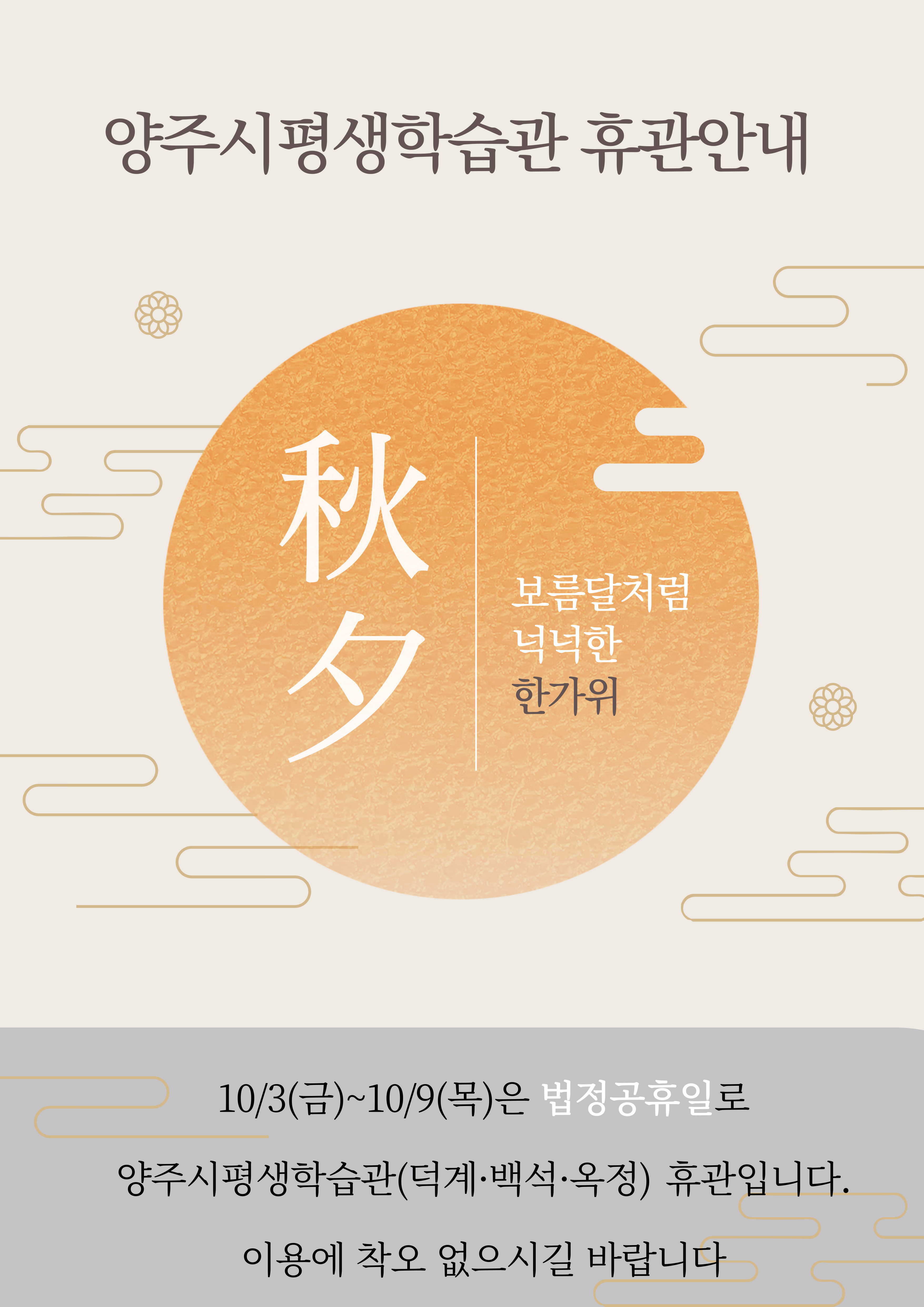 작성일 2025.10.04 정보마당 > 우리시 기관소식 상세보기 - 제목, 부서, 내용, 파일 제공 제목 양주시평생학습관(덕계·백석·옥정) 휴관안내 부서 미래교육과 내용 10/10(금)부터는 정상 수업 진행합니다. 사진 확대보기 파일 휴관안내.jpg 다운로드 미리보기 휴관안내.jpg 다운로드 미리보기 목록 이전글 양주 베이비부머 행복캠퍼스 2025년 하반기 교육생 모집 다음글