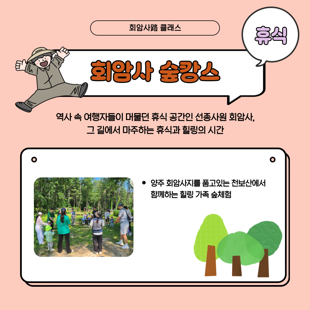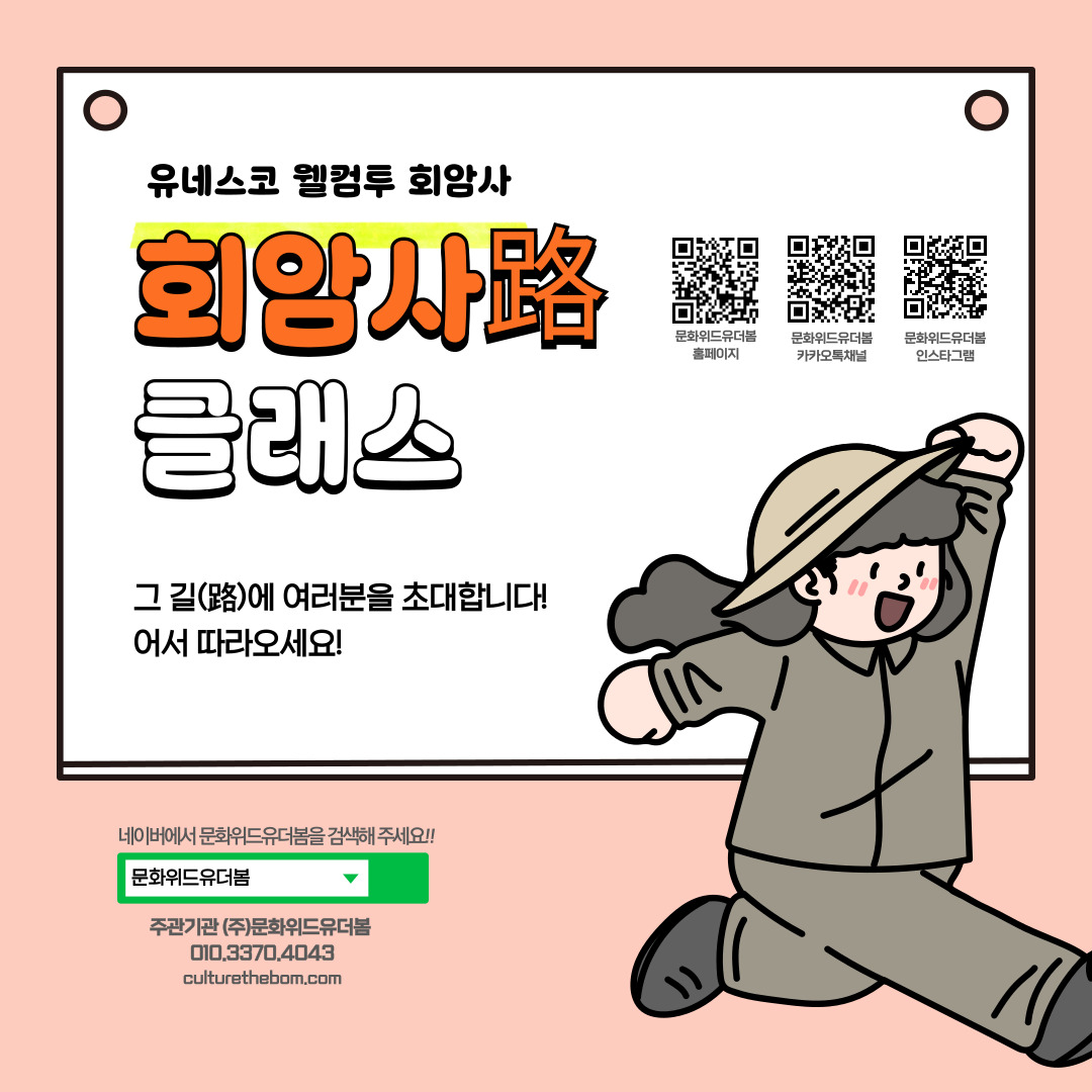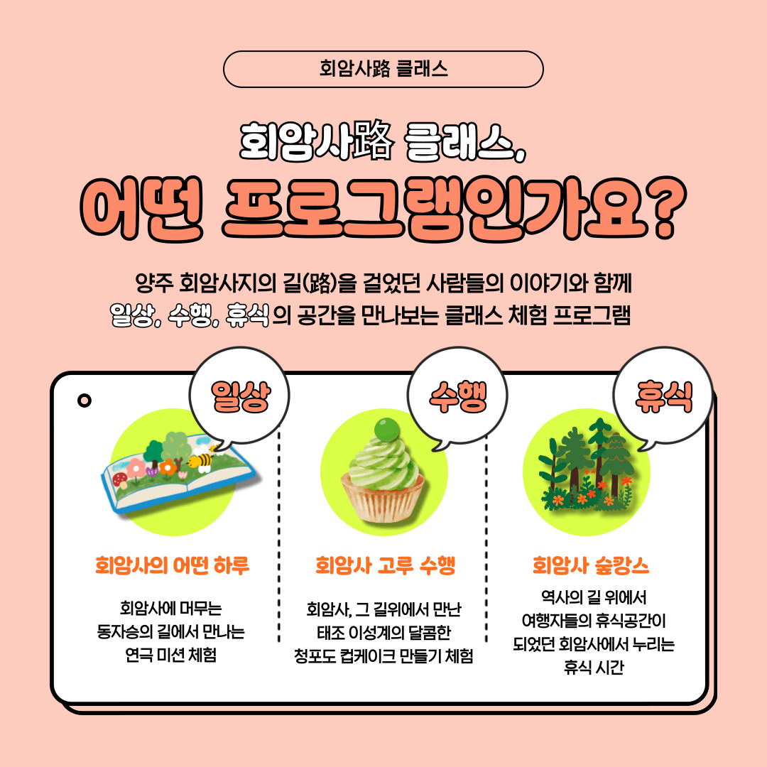 <회암사路 클래스> 양주 회암사지의 길(路)을 걸었던 사람들의 이야기와 함께 일상, 수행, 휴식의 공간을 만나보는 클래스 체험 프로그램 1. 회암사의 어떤 하루 : 회암사에 머물던 동자승의 하루 이야기와 함께하는 연극 미션 활동 2. 회암사 고루 수행 : 회암사에 머물렀던 태조 이성계, 왕이 걸었던 길 위에서 만들어보는 청포도 컵케이크 3. 회암사 숲캉스 : 역사 속 여행자들이 머물던 휴식공간인 선종사원 회암사, 그 길에서 마주하는 휴식과 힐링의 시간 ✔일시 2025년 10월 19일 일요일 ✔회차별 시간 안내 1회차) 9:00 ~ 12:30 2회차) 13:00 ~ 16:30 ✔대상 가족 / 회당 14 가족 ✔참가비 5000원(*현장 결제) ✔신청방법 네이버에서 '문화위드유더봄' 검색 네이버 예약 시스템에서 프로그램, 날짜, 회차 선택 후 예약 진행 (1가족 1매 예약, 참가비 현장 결제) *노쇼 발생 시 재예약 건에 대한 제한이 이루어집니다. 예약 취소를 원하시는 경우 꼭 연락부탁드립니다. 양주 회암사지의 길(路)을 같이 걸어볼까요? |