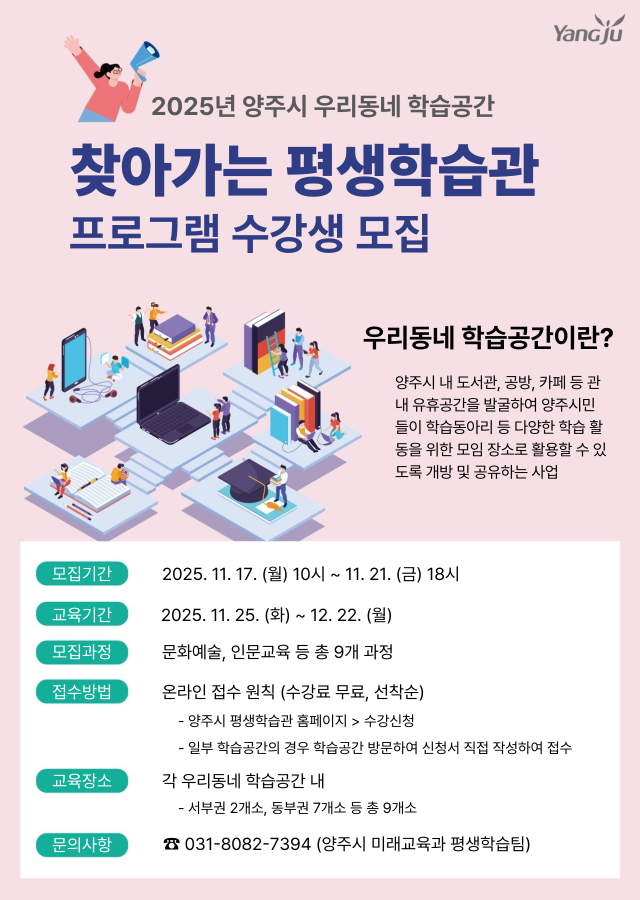 □ 모집기간 : 2025. 11. 17.(월) 10:00 ~ 11. 21. (금) 18시 □ 양주시민을 대상으로 하는 교육 프로그램입니다. □ 교육은 각 우리동네 학습공간에서 이루어지니 정확한 교육 장소는 아래의 포스터를 참고해주시기 바랍니다. □ 방문접수는 LH양주덕정행복아파트, 도자기공방 숲에서만 가능합니다. □ 프로그램은 모집정원 50%미만 시 폐강될 수 있다는 점 참고하시기 바랍니다. 수강신청 바로가기 https://www.yangju.go.kr/lll/selectEduLctreWebList.do?key=1838&lllKind=1 |