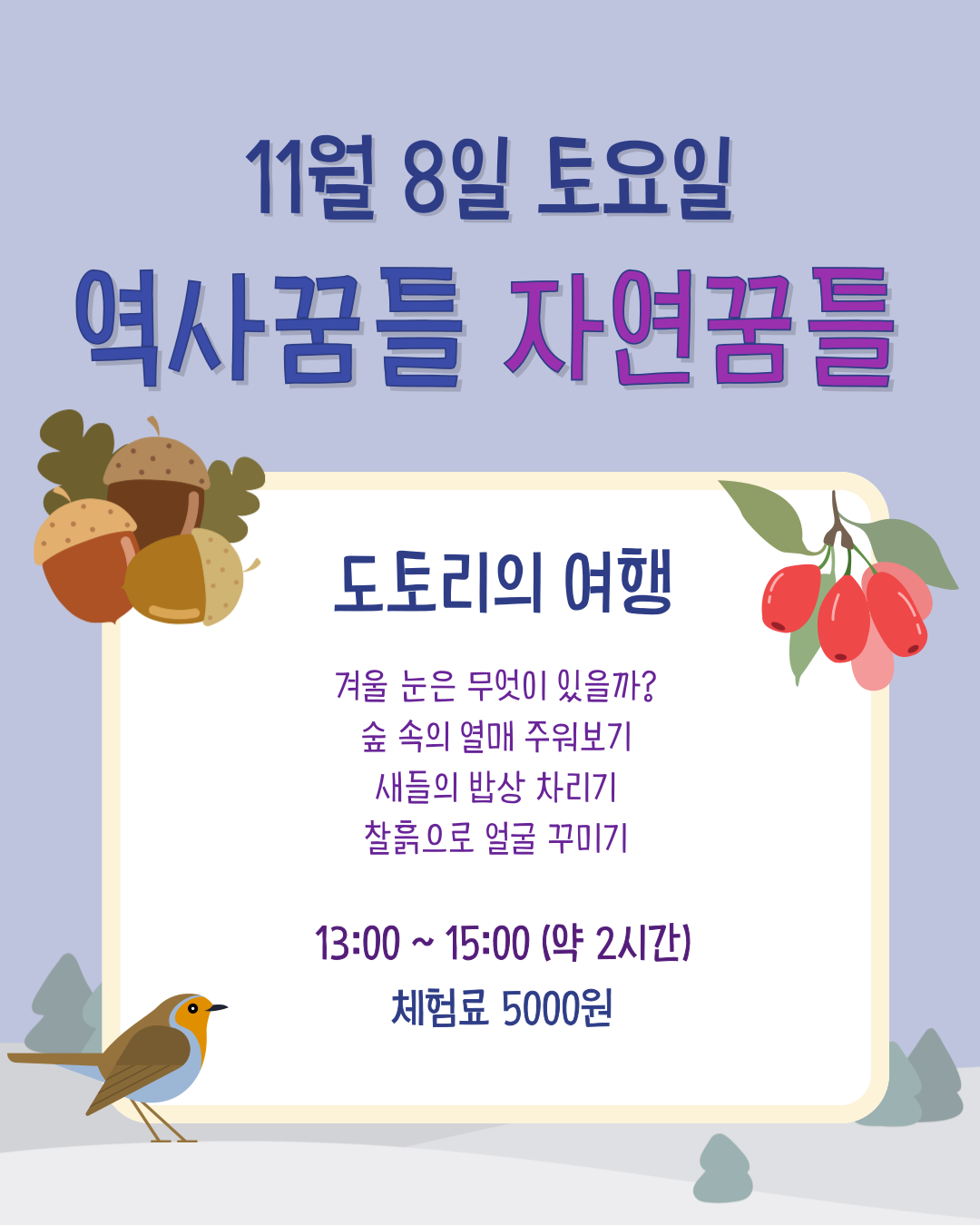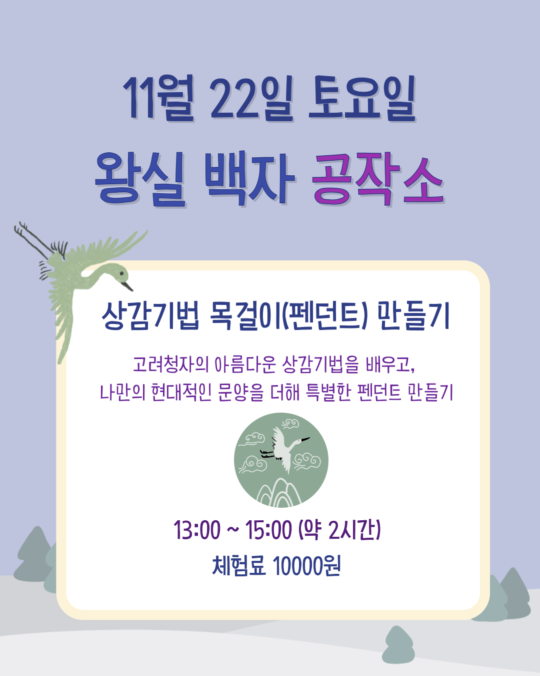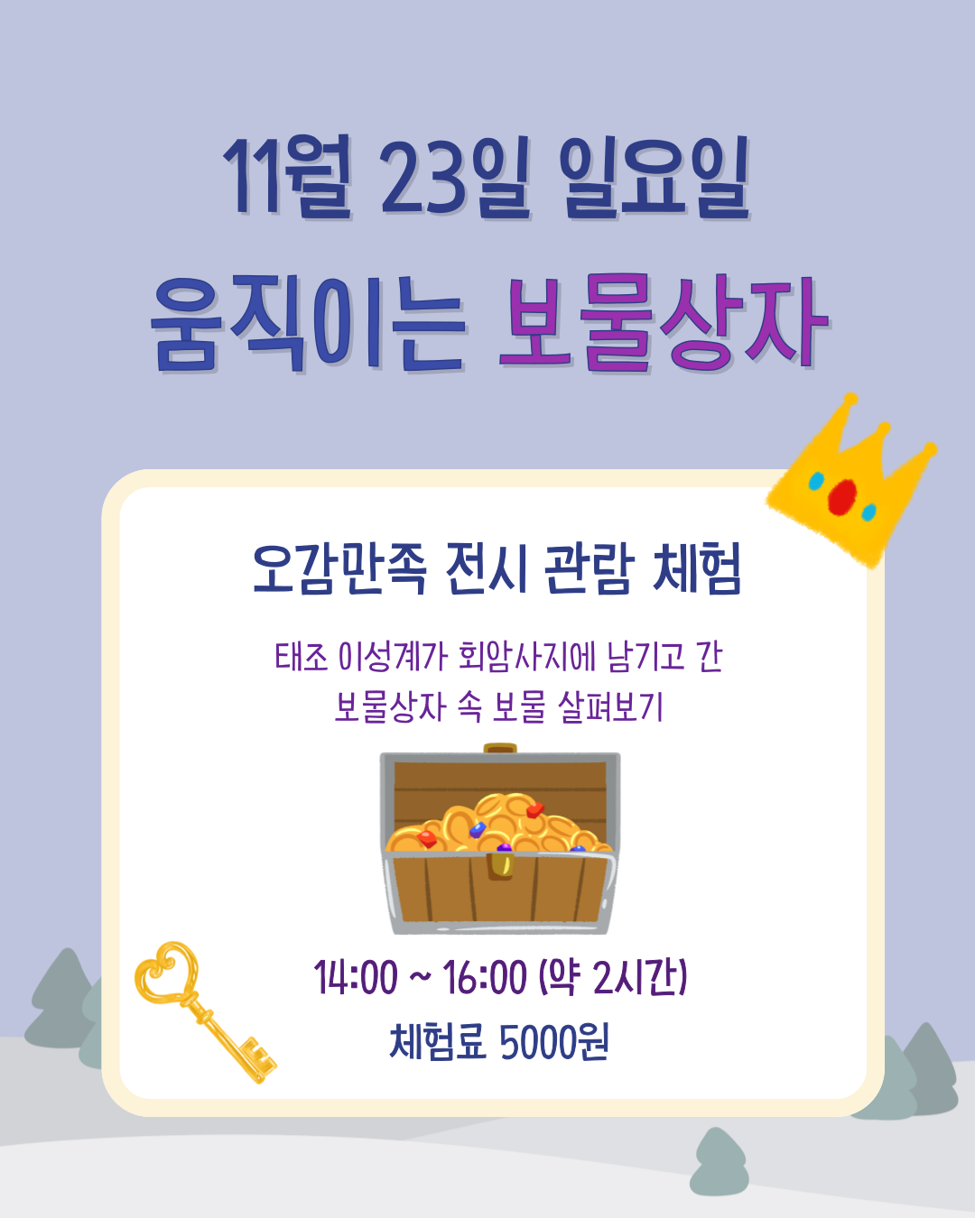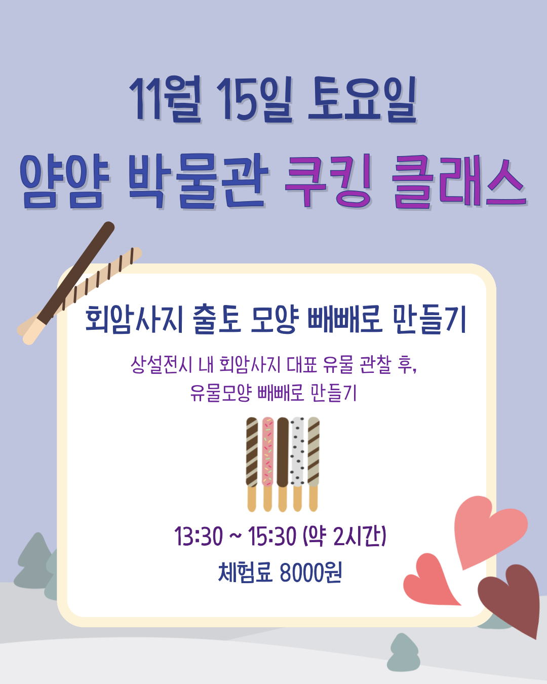 ✔ 일시 : 2025. 11. 1.(토) ~ 30.(일) ✔ 시간 : 토요일 13:00 ~ 15:00 또는 13:30~15:30 / 일요일 14:00 ~16:00 ✔ 장소 : 회암사지 박물관 및 교육동 ✔ 대상 : 유아(6세 이상) ~ 초등학생 ✔ 인원 : 선착순 15명 ✔ 비용 : 프로그램별 상이 ◇ 박물관 전통 오락실 * 내용 : 우리의 열두 띠 비석치기 -십이간지 12띠와 나의 띠를 알아보고 열두 띠가 그려진 비석치기 체험을 해요! -무병장수 ‘나의 띠 장식 장명루 팔찌’ 만들기 * 일시 : 2025. 11. 01.(토) 13:00 ~ 15:00 * 체험료 : 5,000원 ◇ 역사꿈틀 자연꿈틀 * 내용 : 도토리의 여행 -겨울 눈은 무엇이 있을까? -숲 속의 열매 주워보기 -새들의 밥상 차리기 -찰흙으로 얼굴 꾸미기 * 일시 : 2025. 11. 08.(토) 13:00 ~ 15:00 * 체험료 : 5,000원 ◇ 발굴과 과학 * 내용 : 전시실 관찰과 회암사지 유물 발굴 및 복원 체험하기 * 일시 : 2025. 11. 09.(일) 14:00 ~ 16:00 * 체험료 : 5,000원 ◇ 얌얌 박물관 쿠킹클래스 * 내용 : 회암사지 출토 유물모양 빼빼로 만들기 -상설전시 내 회암사지 대표유물 관찰 후, 유물모양 빼빼로 만들기 * 일시: 2025. 11. 15.(토) 13:30 ~ 15:30 * 체험료 : 8.000원 ◇ 왕실 백자 공작소 * 내용 : 상감기법의 목걸이(펜던트) 만들기 -고려청자의 상감기법을 배우고 혅대적인 문양을 그리고 상감하여 펜던트를 만듬 * 일시: 2025. 11. 22.(토) 13:00 ~ 15:00 * 체험료 : 10,000원 ◇ 움직이는 보물상자 * 내용 : 태조 이성계가 회암사지에 남기고 간 보물상자 속 보물 살펴보기 * 일시 : 2025. 11. 23.(일) 14:00 ~ 16:00 * 체험료 : 5,000원 ✔ 예약 : 통합예약 시스템 또는 전화예약 (※ 예약현황에 따라 현장예약 가능) 031-8082-4173 / 4189 |