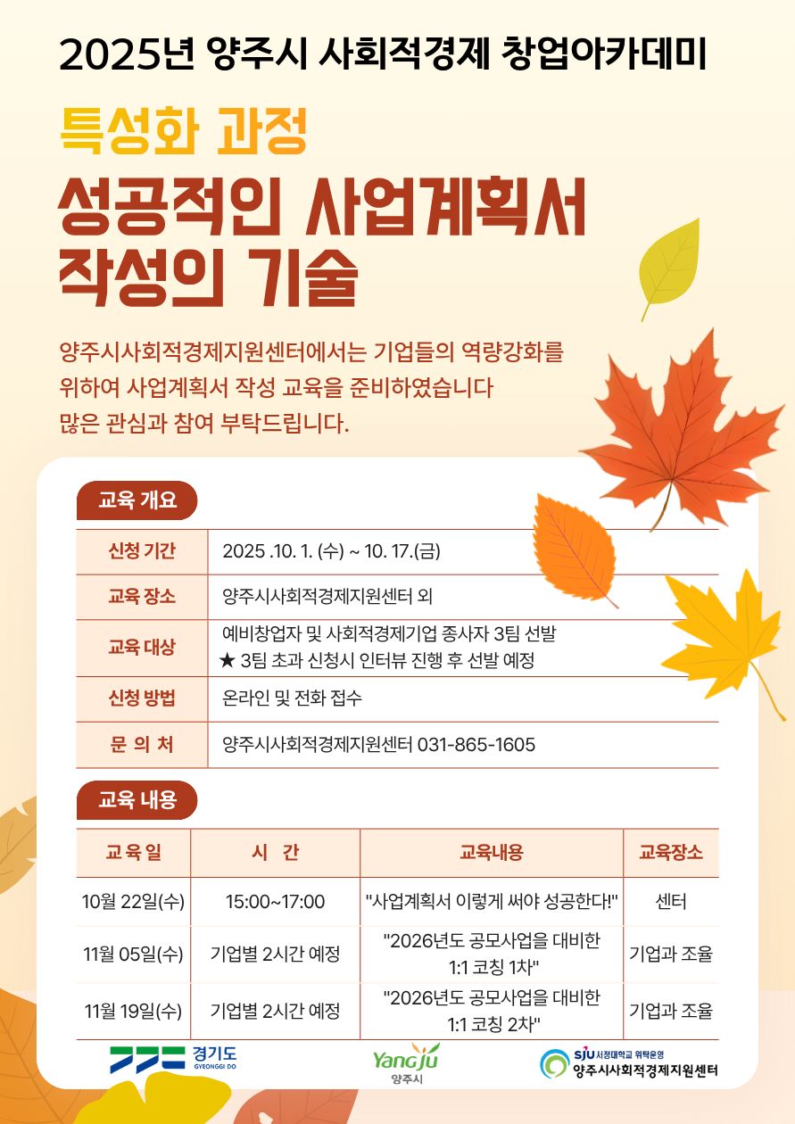 | 제목 | 2025년 양주시 사회적경제 창업아카데미 특성화과정 「성공적인 사업계획서 작성의 기술」 교육 안내 |