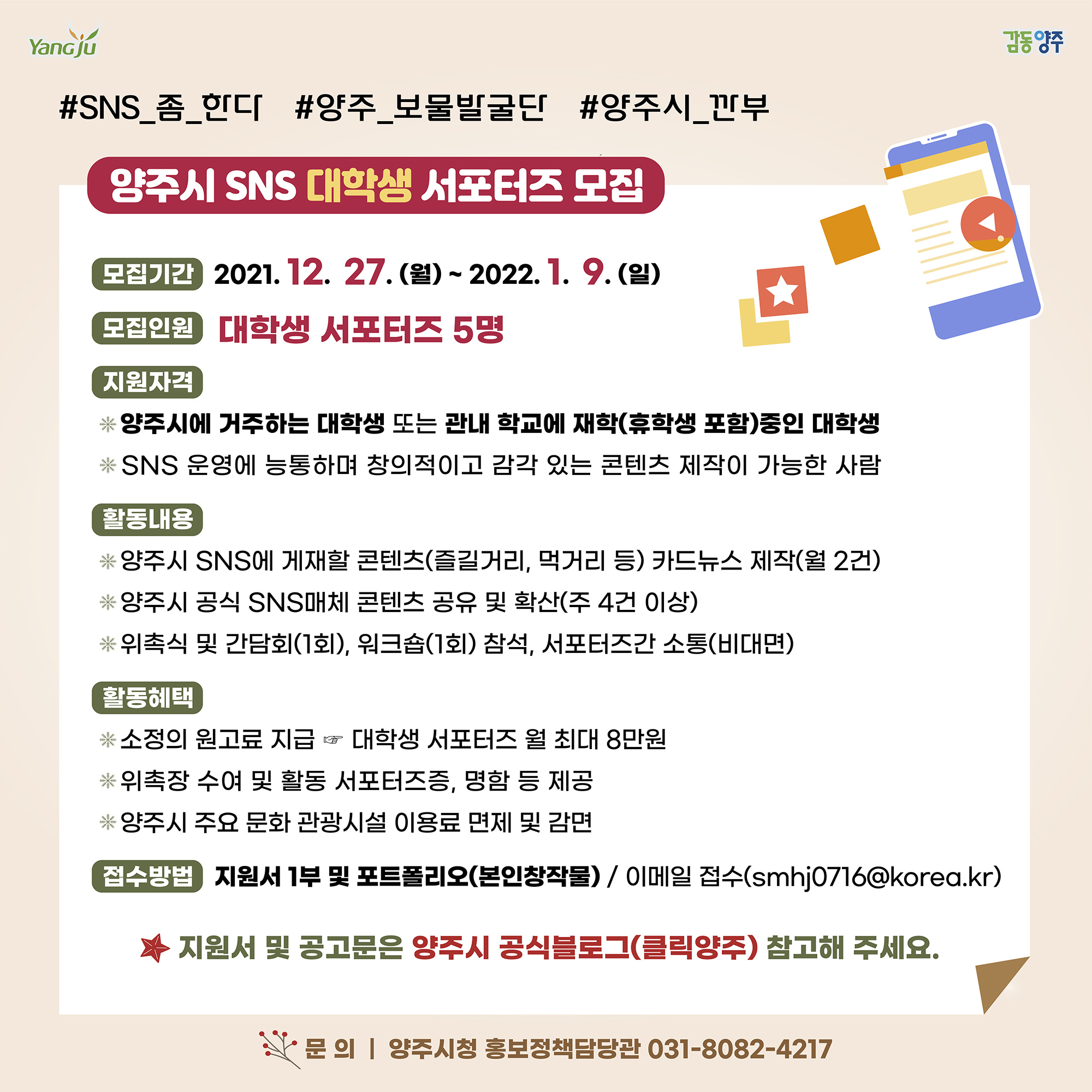 □ 모집인원 대학생 서포터즈 5명 □ 지원자격 - 양주시에 거주하는 대학생 또는 관내 학교에 재학(휴학생 포함)중인 대학생 * 관내 학생 증빙서류 제출 : 재학증명서 - SNS 운영에 능통하며 창의적이고 감각 있는 콘텐츠 제작이 가능한 사람 □ 활동내용 - 양주시 SNS에 게재할 콘텐츠(즐길거리, 먹거리 등) 카드뉴스 제작(월 2건) - 양주시 공식 SNS매체 콘텐츠 공유 및 확산(주 4건 이상) - 위촉식 및 간담회(1회), 워크숍(1회) 참석, 서포터즈간 소통(비대면) □ 활동혜택 - 소정의 원고료 지급 ☞ 대학생 서포터즈 월 최대 8만원 - 위촉장 수여 및 활동 서포터즈증, 명함 등 제공 - 양주시 주요 문화 관광시설 이용료 면제 및 감면 □ 접수방법 지원서 1부 및 포트폴리오(본인창작물) / 이메일 접수(smhj0716@korea.kr) ※ 자세한 사항은 첨부파일(공고문 및 지원서)을 확인하시기 바랍니다. |