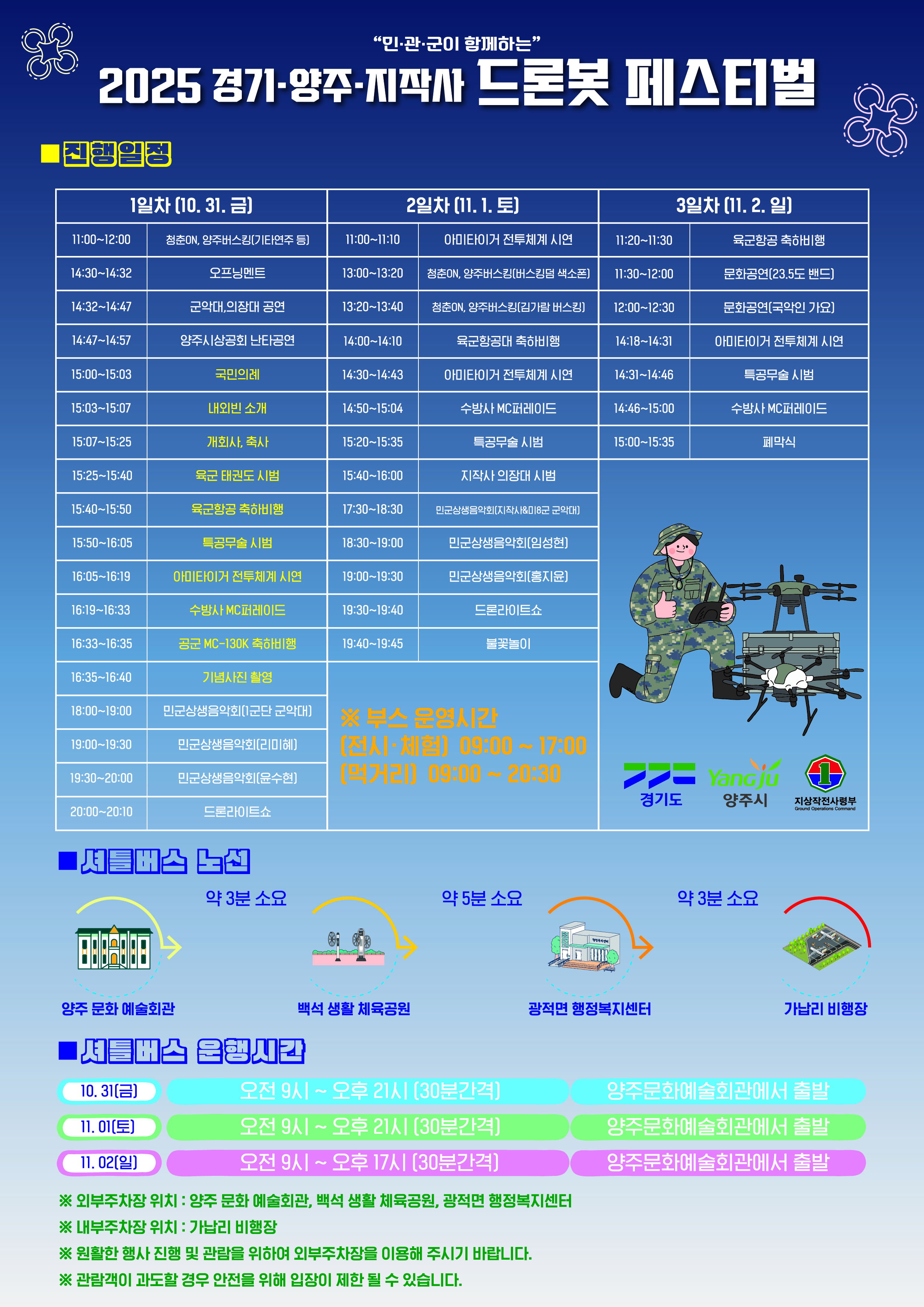 ‘2025 경기‧양주‧지작사 드론봇 페스티벌’은 경기도, 양주시, 지상작전사령부가 공동 주최하는 민ㆍ관ㆍ군 상생 페스티벌이다. 2025년 10월 31일부터 11월 2일까지 3일간 양주시 광적면 가납리비행장에서 개최된다. 본 축제는 「양주시 드론산업 육성 및 지원에 관한 조례」와 「가납리 비행장 민·관·군 상생발전을 위한 업무협약」을 근거로 서부권 대표 축제를 육성하고, 드론 산업 기반을 마련하여 지역 균형발전을 도모하는 것이 목적이다. 육군의 드론봇 전투체계 시연, 주한미군 전투장비 전시, 국내외 첨단 드론·로봇 기업 전시, 드론봇 경연대회, 다채로운 군문화 공연 및 시민 체험 프로그램을 통해 첨단 국방력과 4차 산업의 미래를 조망하는 행사이다.