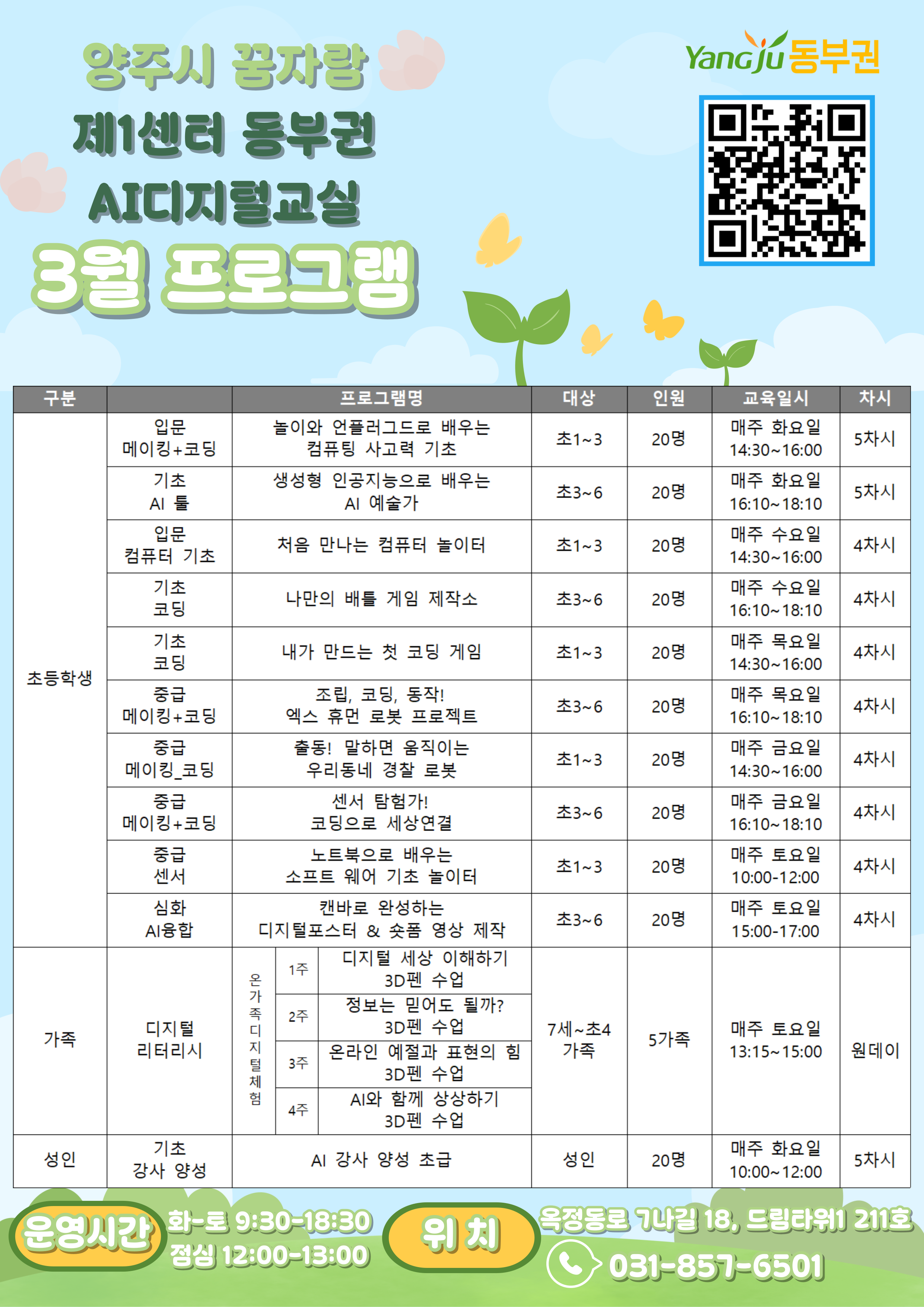 동부권 AI 디지털 교실 3월 프로그램이 오픈 되었습니다아이들의 디지털 리터러시와 다채로운 역량강화를 위해 많은 관심과 참여 부탁드립니다.
