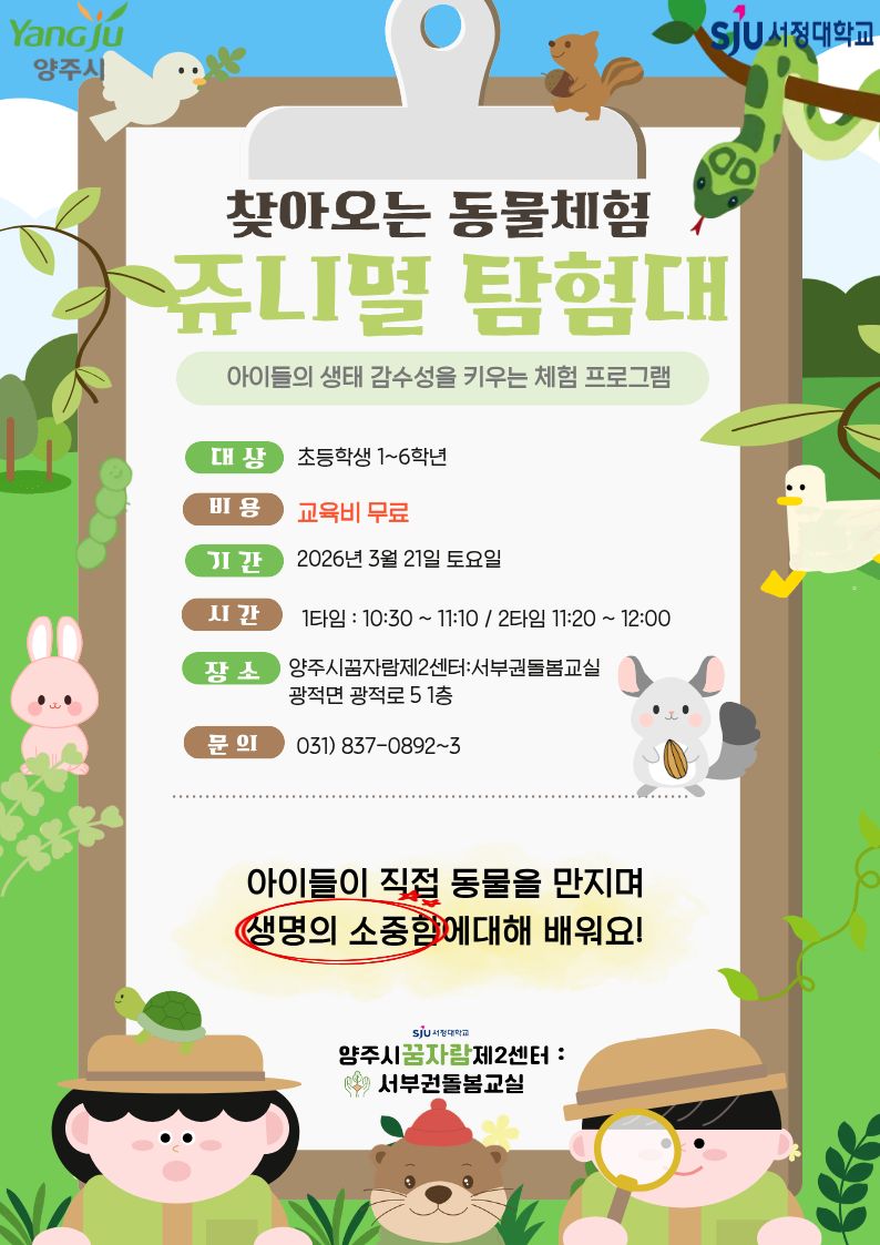 안녕하세요! 양주시꿈자람제2센터:서부권돌봄교입니다!🥰 3월 쥬니멀 탐험대 프로그램 신청을 받습니다! -------------------------------------------------------- 📍쥬니멀 1타임 10:30~11:10 📍쥬니멀 2타임 11:20~12:00 신청 사이트는 3월 3일 화요일 오후 7시에 열립니다!