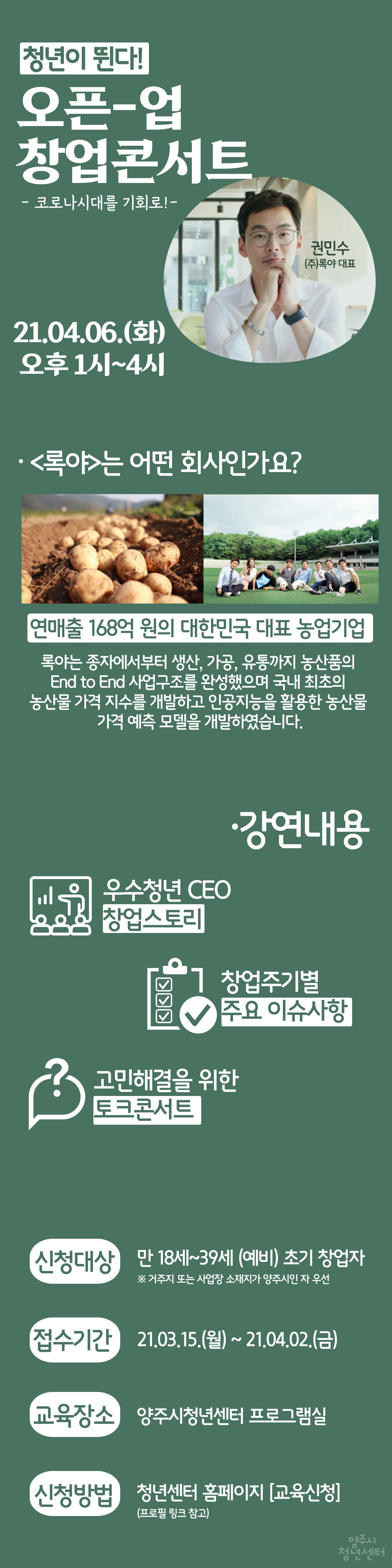홈 센터소식 공지사항 공지사항 복사 프린트 함께마당 > 공지사항 상세보기 - 제목, 작성자, 내용, 파일 제공 제목 『청년이 뛴다!』 오픈업 창업콘서트 참여자 모집 작성자 일자리정책과 내용 『청년이 뛴다!』 오픈업 창업콘서트 참여자 모집 사진 확대보기 파일 오픈업-창업콘서트 (1).jpg 다운로드 미리보기 커리큘럼 및 강사진 안내.hwp 다운로드 미리보기 목록 이전글 [청년창업지원사업] 창업전문가와 함께하는 초기창업자 엑셀러레이팅 참여자 모집 다음글 [창업전문교육] 2021 '청년이 뛴다! 창업아카데미' 교육생 모집