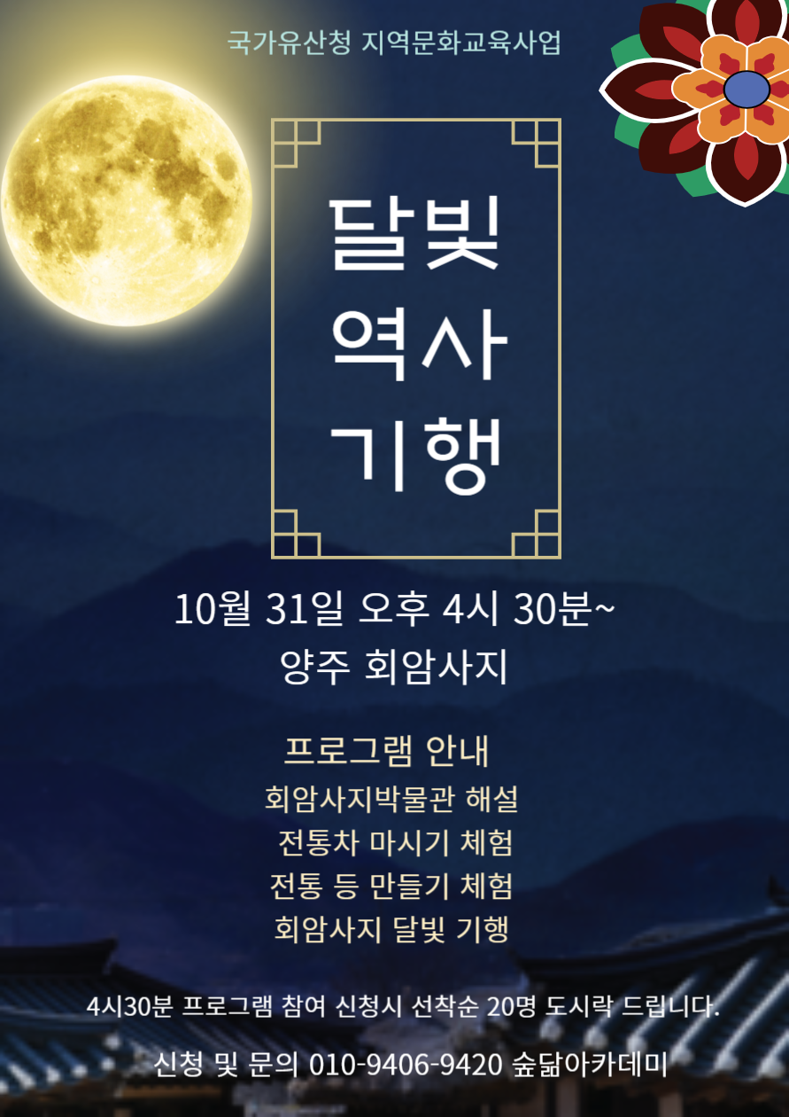 양주시 회암사지에서 펼쳐지는 특별한 역사 여행, <달빛 역사 기행>에 여러분을 초대합니다. ⠀ 일시: 10월 31일(금) 오후 4시 30분~ 장소: 양주 회암사지 ⠀ 프로그램 안내 회암사지박물관 해설 전통차 마시기 체험 전통 등 만들기 체험 회암사지 달빛 기행 ⠀ 참여 혜택 프로그램 참여 신청 시, 선착순 20명에게 도시락이 제공됩니다. ⠀ 신청 및 문의 숲닮아카데미 (이미지 하단의 전화번호 참조) ⠀ 달빛 아래 펼쳐지는 회암사지의 고요한 시간, 역사와 함께하는 특별한 가을밤을 놓치지 마세요! |