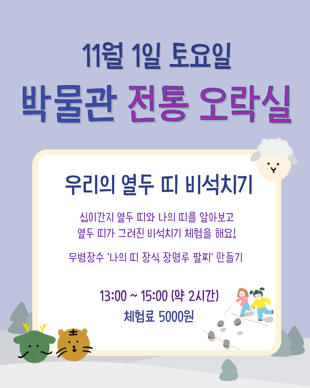 ✔ 일시 : 2025. 11. 1.(토) ~ 30.(일) ✔ 시간 : 토요일 13:00 ~ 15:00 또는 13:30~15:30 / 일요일 14:00 ~16:00 ✔ 장소 : 회암사지 박물관 및 교육동 ✔ 대상 : 유아(6세 이상) ~ 초등학생 ✔ 인원 : 선착순 15명 ✔ 비용 : 프로그램별 상이 ◇ 박물관 전통 오락실 * 내용 : 우리의 열두 띠 비석치기 -십이간지 12띠와 나의 띠를 알아보고 열두 띠가 그려진 비석치기 체험을 해요! -무병장수 ‘나의 띠 장식 장명루 팔찌’ 만들기 * 일시 : 2025. 11. 01.(토) 13:00 ~ 15:00 * 체험료 : 5,000원 ◇ 역사꿈틀 자연꿈틀 * 내용 : 도토리의 여행 -겨울 눈은 무엇이 있을까? -숲 속의 열매 주워보기 -새들의 밥상 차리기 -찰흙으로 얼굴 꾸미기 * 일시 : 2025. 11. 08.(토) 13:00 ~ 15:00 * 체험료 : 5,000원 ◇ 발굴과 과학 * 내용 : 전시실 관찰과 회암사지 유물 발굴 및 복원 체험하기 * 일시 : 2025. 11. 09.(일) 14:00 ~ 16:00 * 체험료 : 5,000원 ◇ 얌얌 박물관 쿠킹클래스 * 내용 : 회암사지 출토 유물모양 빼빼로 만들기 -상설전시 내 회암사지 대표유물 관찰 후, 유물모양 빼빼로 만들기 * 일시: 2025. 11. 15.(토) 13:30 ~ 15:30 * 체험료 : 8.000원 ◇ 왕실 백자 공작소 * 내용 : 상감기법의 목걸이(펜던트) 만들기 -고려청자의 상감기법을 배우고 혅대적인 문양을 그리고 상감하여 펜던트를 만듬 * 일시: 2025. 11. 22.(토) 13:00 ~ 15:00 * 체험료 : 10,000원 ◇ 움직이는 보물상자 * 내용 : 태조 이성계가 회암사지에 남기고 간 보물상자 속 보물 살펴보기 * 일시 : 2025. 11. 23.(일) 14:00 ~ 16:00 * 체험료 : 5,000원 ✔ 예약 : 통합예약 시스템 또는 전화예약 (※ 예약현황에 따라 현장예약 가능) 031-8082-4173 / 4189 |