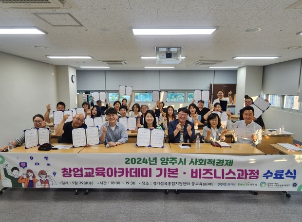 양주시가 지난 29일 관내 경기섬유종합지원센터 중교육실에서 ‘2024년 사회적경제 창업교육아카데미 기본·비즈니스 과정 수료식’을 개최했다고 밝혔다.