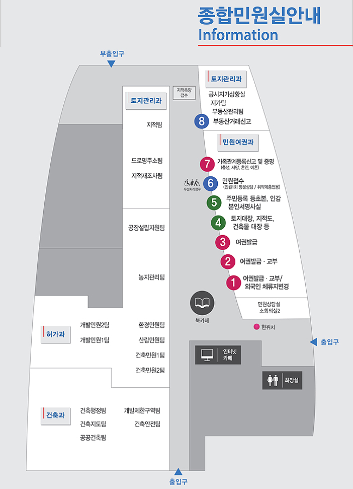 현위치를 기준(동서남북)으로 정면(서쪽)에 북카페 후면(동쪽) 출입구, 좌측(남쪽)으로 화장실, 인터넷카페가 있습니다. 북카페를 기준으로 직선 복도가 있으며, 복도 양쪽으로 민원과들이 있습니다. 현위치 기준 우측(북쪽)에 하수과 [민원상담실/소회의실2]. 민원여권과 [1번창구:여권부/어디서나 민원/외국인 체류지변경/국세증명], [2번·3번창구:여권발급], [4번창구:토지대장, 지적도, 건축물 대장 등], [5번창구:주민등록 등초본, 인감, 본인서명사실], [6번창구:민원접수(민원1회 방문상담창구/취약계층전용창구) - 장애인, 임산부, 노약자 우선처리창구입니다.] [7번창구:가족관계등록신고 및 증명(출생, 사망, 혼인, 이혼)]. 토지관리과 [8번창구:부동산 거래신고], [부동산관리팀], [공시지가상황실 지가팀] 있으며, 토지관리과에서 '지적측량 접수'가 가능합니다. 토지관리과에서 서쪽으로 부출입구가 있으며, 부출입구 정면(남쪽)에 토지관리과 [지적팀], [도로명주소팀], [지적재조사팀]. 허가과 [공장설립지원팀], [농지관리팀], [환경민원팀], [산림민원팀], [건축민원1팀], [건축민원2팀], [개발민원2팀], [개발민원1팀]. 주택과 [주택행정팀], [공동주택팀], [주거복지팀], [공동주택지원팀]이 있습니다. 주택과 바로 옆으로 출입구가 하나 더 있습니다.